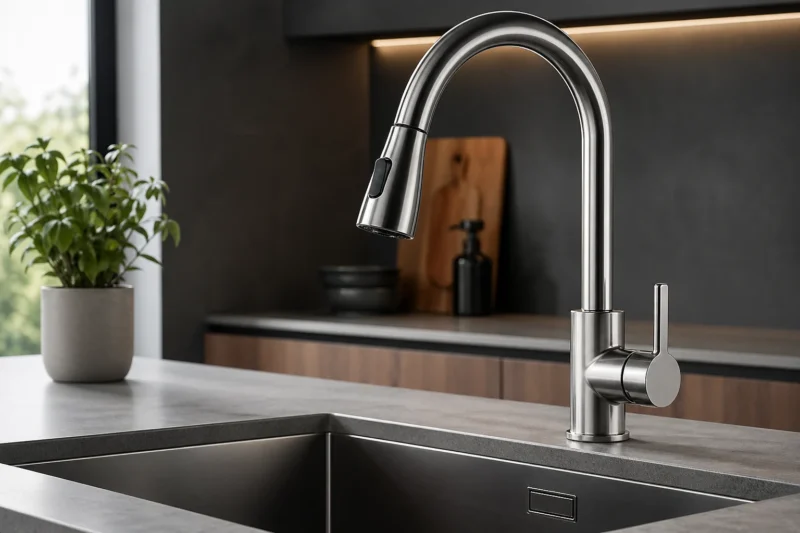 Для большинства кухонь оптимален однорычажный смеситель из латуни или нержавеющей стали, с керамическим картриджем, поворотным изливом и аэратором. Если мойка глубокая или двойная, стоит смотреть в сторону модели с выдвижной лейкой. Если кухня маленькая, лучше не гнаться за высоким корпусом: он может выглядеть эффектно, но давать лишние брызги.