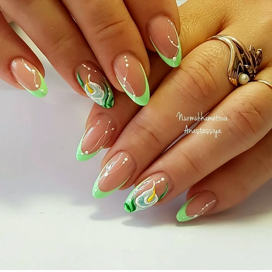 Кольоровий френч на мигдалеподібних нігтях з дизайном – це стильне та модне рішення для тих, хто прагне виглядати елегантно та оригінально. Мигдалеподібна форма нігтів відмінно підходить для створення ніжних та жіночних образів. Вона робить руки візуально більш стрункими та подовженими. Кольоровий френч надає нігтям особливого шарму і дозволяє висловити свою індивідуальність.