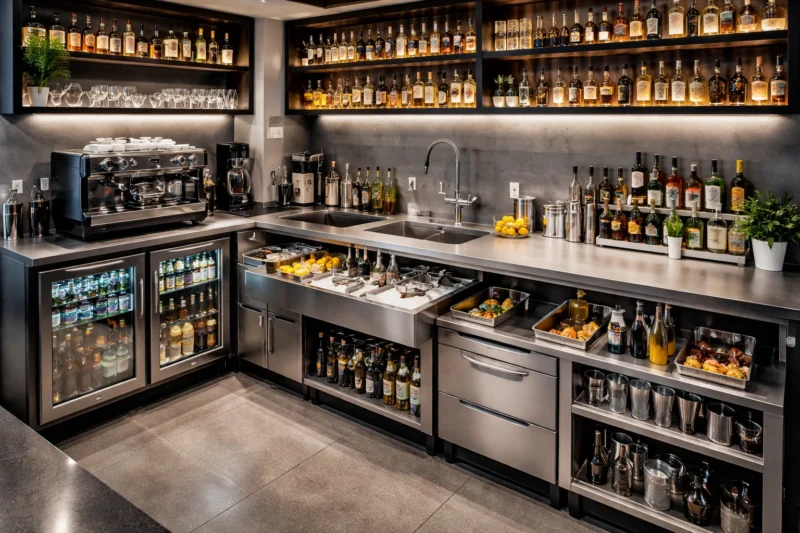 Базове обладнання для відкриття бару охоплює кілька ключових категорій. У центрі роботи зазвичай стоїть станція бармена — робоче місце, де все розташовано під рукою. Вона допомагає організувати барну зону так, щоб персонал працював швидко і без зайвих рухів.