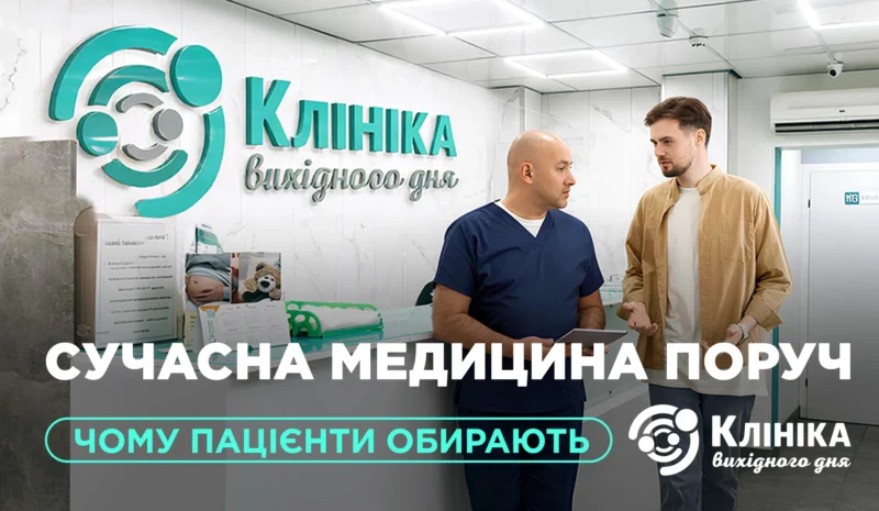Клініка вихідного дня — це сучасний медичний центр у Києві (Борщагівка), де пацієнти можуть отримати комплексну допомогу без черг, зайвого стресу та втрати часу. Тут поєднуються консультації лікарів, лабораторні аналізи, УЗД-діагностика та лікування в одному місці, що особливо важливо для людей із насиченим графіком. Головна мета клініки — зробити медицину доступною, зрозумілою та ефективною для кожного пацієнта.